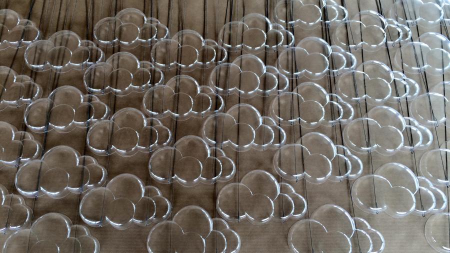 Nuages PETG thermoformé, découpe ouate et intégration. Suspentes nuages corde à piano. Portiques acier soudé par points, finition laqué. Base PMMA, finition vernis effet givre.